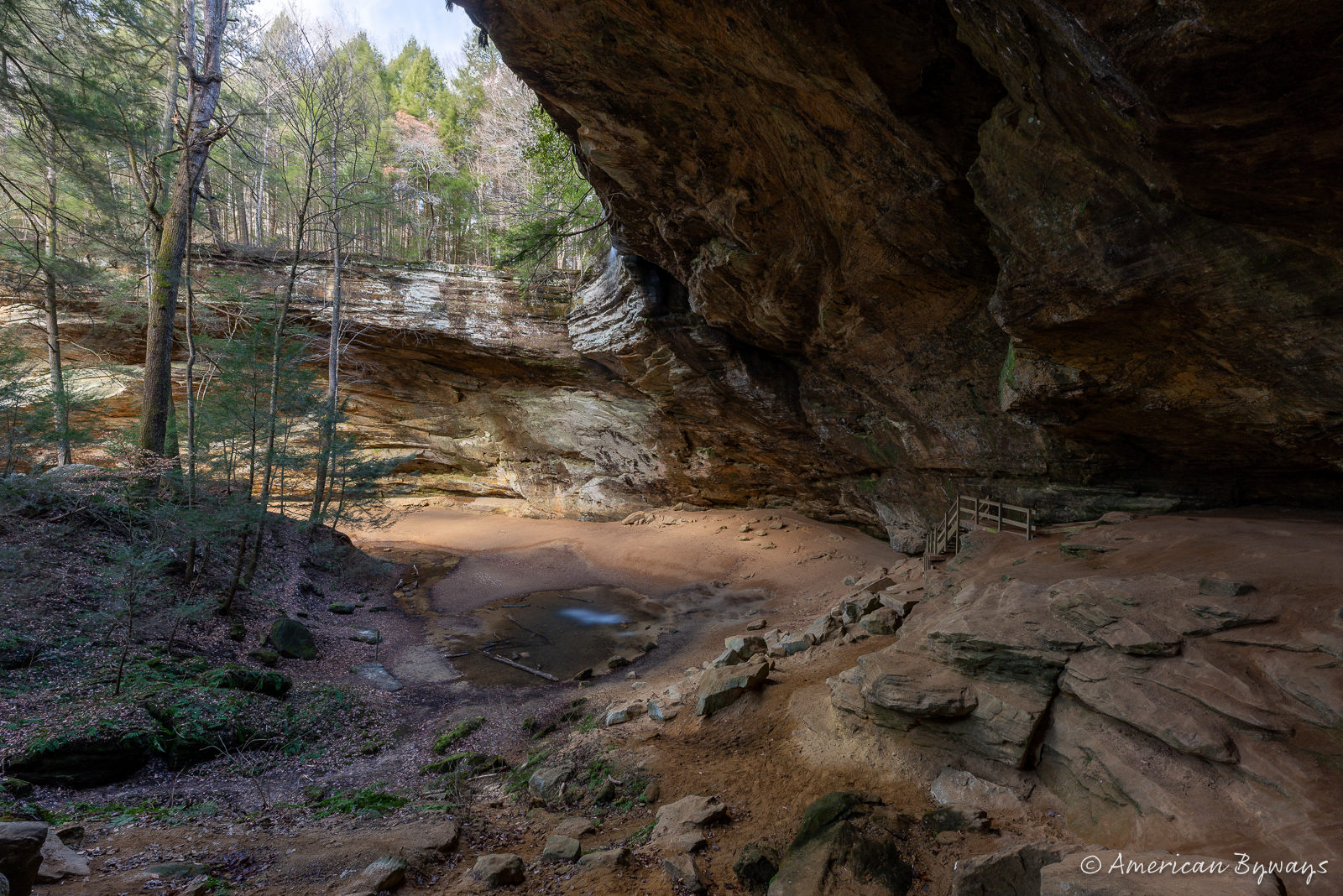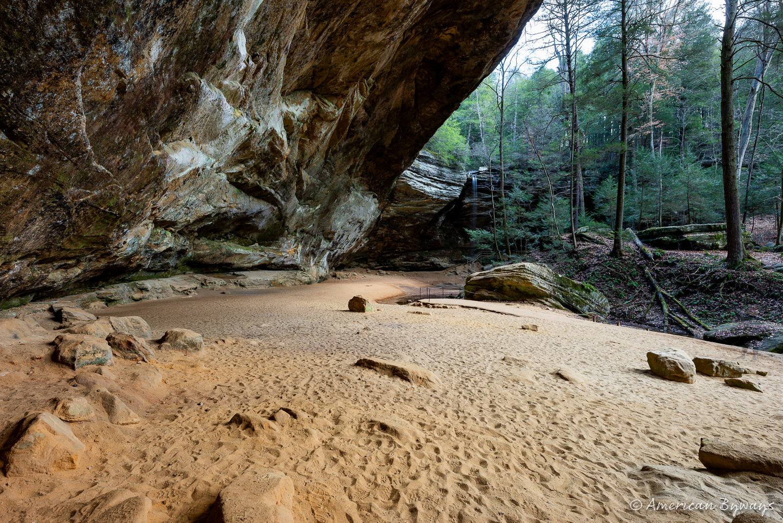 The following day, we enjoyed a hearty breakfast before setting out to explore Ash Cave. The area was tranquil, with only the gentle rumble of a 100-foot waterfall along the East Fork of Queer Creek breaking the silence. Ash Cave, Ohio’s oldest recessed cave, is an impressive sight, measuring 700 feet in length and 100 feet in depth, with traces of history in the form of massive ash piles. These piles likely originated from Native American campfires or early smelting activities, giving the cave its name.