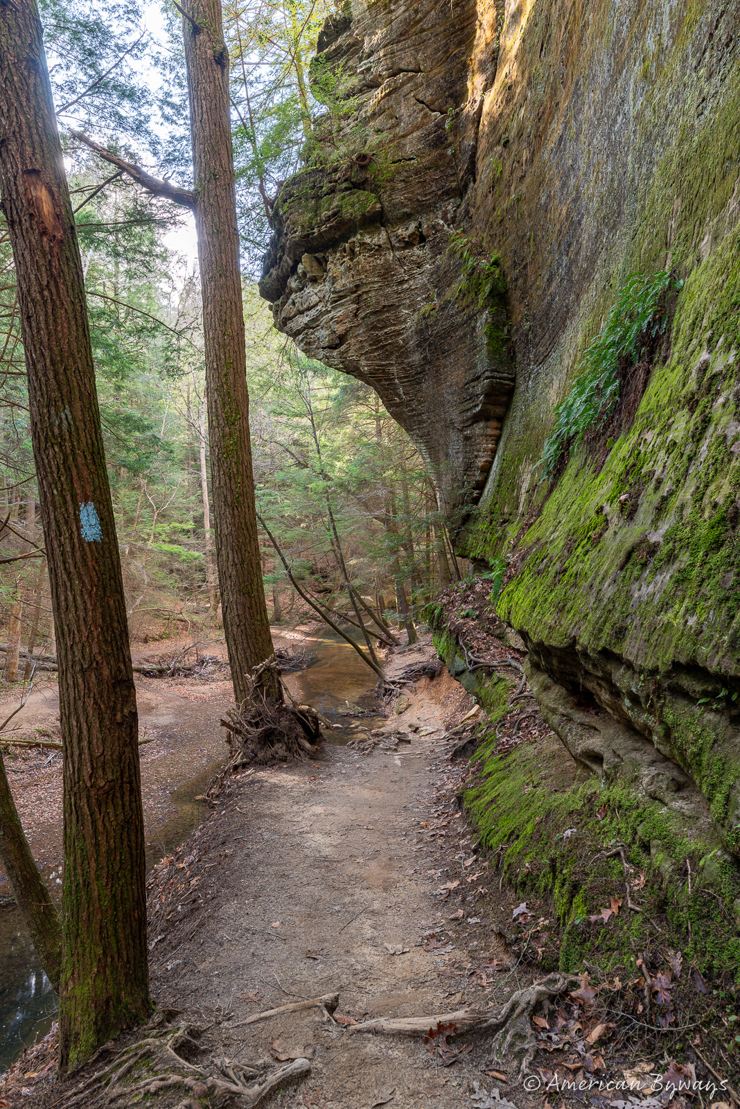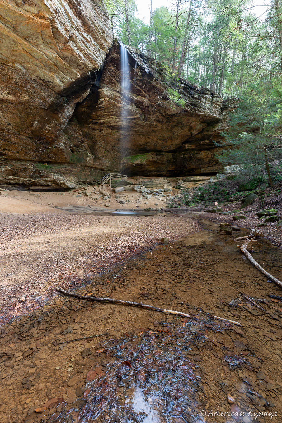Cedar Falls, located along Queer Creek, is known as Hocking Hills’ most voluminous waterfall. In the mid-1850s, a mill was built just above this impressive 50-foot horsetail cascade. Interestingly, the area got its name from the tall hemlock trees present there, which were mistakenly identified as cedars.