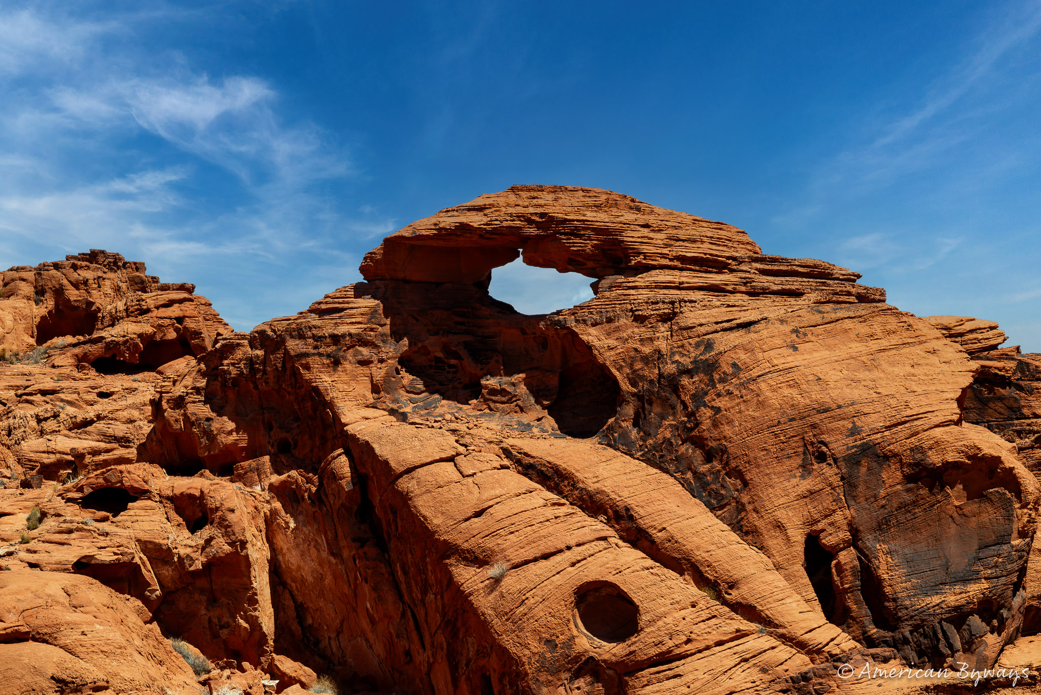 The city’s sprawl gave way quickly to open desert, and soon we were surrounded by red rock outcrops and distant ridgelines beneath a sky streaked with thin, high clouds. As we approached the entrance to Valley of Fire State Park, the landscape sharpened—sandstone bluffs rose on either side of the road, their colors deepening in the morning light. It was easy to see why early visitors gave this place its name: the valley looked as though it had been set ablaze by the sun.